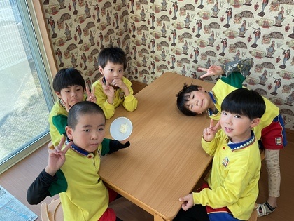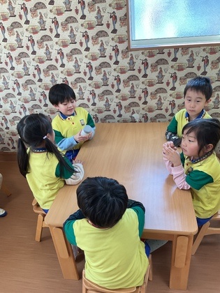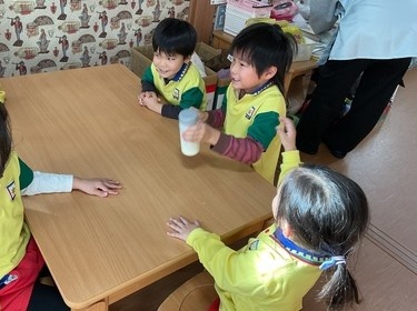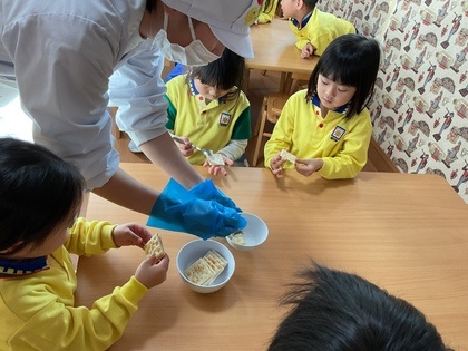 食育~バター作り~ 先日、どんぐりぐみ、たいようぐみで食育を行いました。 今回は、バター作りをしましたよ! 容器に牛乳をいれて15分振るとバターが出来上がるのですが、15分間振り続けるのは大変なので 1人2分ずつ交代して振りました。 一生懸命に容器を振ったり、振っていない周りの子も一緒に身体を動かして楽しそうでしたよ! 出来上がったバターはクラッカーにつけて食べました。